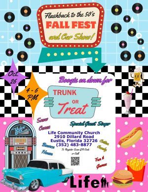 Come join us for our annual Fall festival and car show!! This “Flashback to the 50’s” themed Fall fest will ...