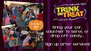 Join us for a family friendly Trunk or Treat event! Candy, food, and fall fun!