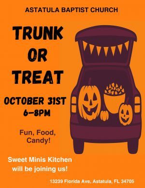 Astatula Baptist Church invites you and your family to a fun night of candy, food, and fellowship! Bring the kids in ...